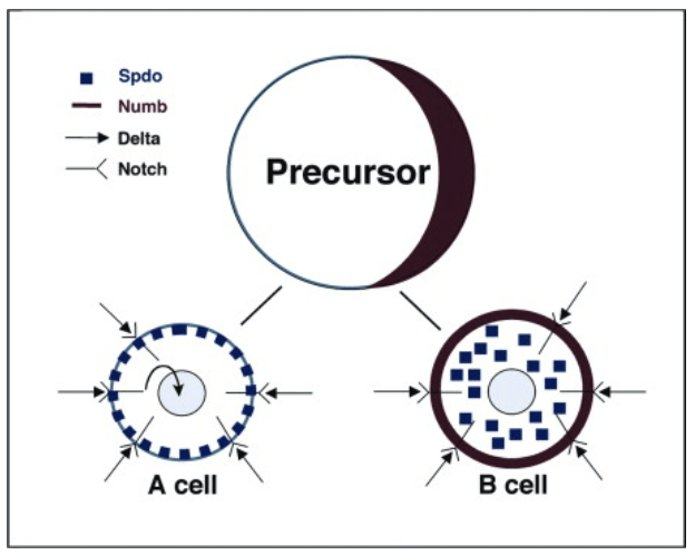 L’un des principaux modèles où Numb (et Notch) a été étudié est la neurogenèse chez la drosophile. Le développement du système nerveux central de la drosophile commence dans l’ectoderme ventrolatéral, dans la région dite neurogénique où théoriquement toutes les cellules groupées en cluster exprimant le gène achaete-scute (orthologue de Ascl1) peuvent participer au système nerveux. Les interactions cellulaires médiées par Notch régulent la sélection de cellules souches neurales individuelles ou neuroblastes (NB) au sein du cluster.