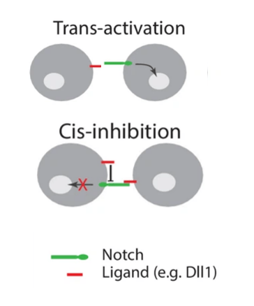 Des cas de cis-inhibitions ont été rapportés : les ligands et les récepteurs Notch co-exprimés dans la même cellule s’inhibent mutuellement, supprimant la signalisation intercellulaire (Sprinzak et al., 2010 ; del Álamo et al., 2011 ; Fiuza et al., 2010).