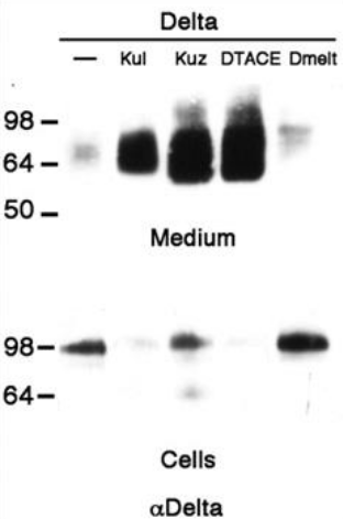 Les ligands de Notch peuvent être clivés par des protéines de la famille ADAM, créant de formes solubles de ligands, ce qui a pour effet de diminuer le signal activateur de Notch (Zolkiewska, 2008). Par exemple lors du développement de l’aile de drosophile, l’orthologue d’ADAM10, Kuzbanian-like (Kbl) est nécessaire pour cliver Delta et permettre un développement normal de la marge et des « veines » de l’aile (Sapir et al., 2005).