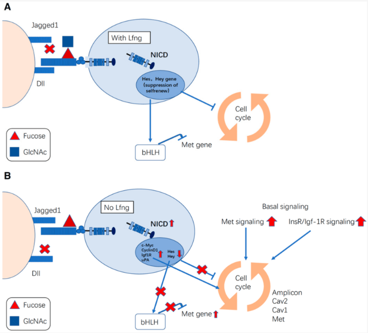 Egalement, la signalisation par un ligand fort peut être réduite lors de l’expression d’un deuxième ligand qui active un signal plus faible, car ce ligand est en compétition avec le premier pour se lier à Notch (Benedito et al., 2009 ; Petrovic et al., 2014). De plus, les glycotransférases Fringe augmentent l’affinité entre les récepteurs Notch et certains de ses ligands (Panin et al., 1997), fournissant une couche régulatrice supplémentaire. Les enzymes Fringe ajoute une N-acétylglucosamine sur un O-fucose préalablement ajouté sur Notch au cours de sa maturation. Dans ce cas, Notch a en général plus d’affinités pour les ligands Delta mais moins d’affinités pour les ligands Jagged et/ou Serrate. La balance entre ces deux ligands influence de nombreux processus développementaux mais aussi lors de la tumorigenèse.