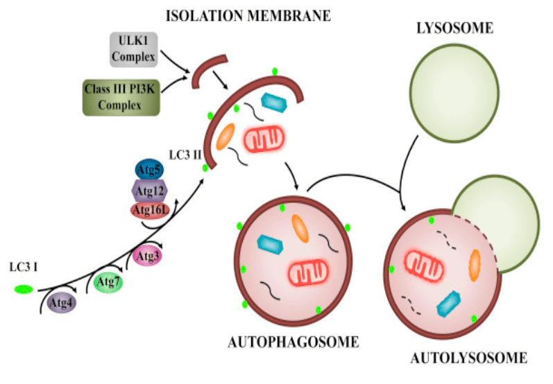Pour initier la biogenèse des autophagosomes, plusieurs complexes ULK sont assemblés et l’ensemble fonctionne comme un échafaudage pour le recrutement d’autres protéines ATG. Le complexe ULK/ATG permet le recrutement et l’activation de complexes PI3K (phosphatidylinositol 3-kinase) qui permettent l’incorporation du phosphatidylinositol 3-phosphate (PIP3) dans les membranes à partir desquelles les autophagosomes sont générés. Ensuite, les protéines WIPI 1-4 se lient au PIP3 et recrutent les deux prochains composants importants de l’expansion des phagophores : les protéines ATG2 et le complexe ATG16L1 (Allmanai et al., 2022).
