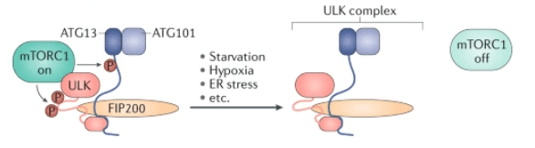 Tant que TORC1 est actif, l’initiation de l’autophagie est inhibée par sa phosphorylation des protéines ULK et ATG13. Lorsque TORC1 n’est pas activé (dans les conditions vues au paragraphe précédent), ULK et ATG13 ne sont plus phosphorylés et l’assemblage de la membrane d’isolement peut commencer.