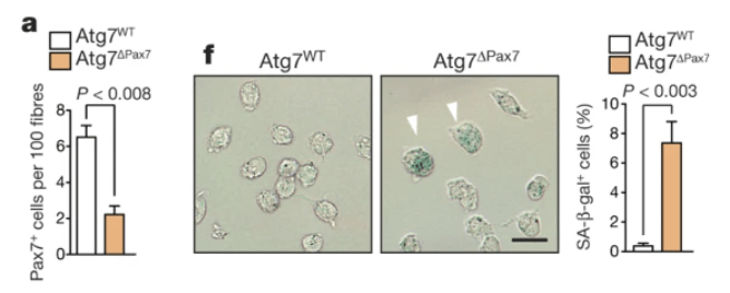 Des études dans les cellules souches musculaires adultes (les cellules satellites) ont montré que l’inhibition de TORC1 par la rapamycine peut activer l’autophagie et éviter la sénescence liée à l’âge dans ces cellules souches (Garcia-Prat et al., 2016). Si on élimine l’expression d’Atg7 dans ces cellules et donc on inhibe l’autophagie, il y a une augmentation de la sénescence et une chute importante du nombre de cellules satellites par fibre musculaire.