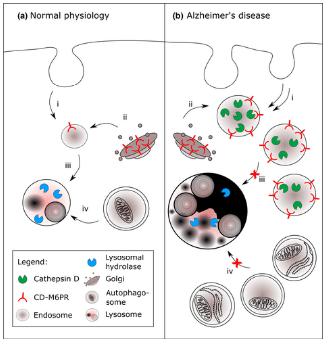 Des perturbations de l’autophagie sont observées dans de nombreuses pathologies. Par exemple dans la maladie d’Alzheimer, les autophagosomes n’arrivent pas à fusionner avec les lysosomes ce qui crée un engorgement (Whyte et al., 2016). Ces dysfonctionnements peuvent précéder de plusieurs années l’apparition des symptomes de la maladie d’Alzheimer (Cataldo et al., 2000).