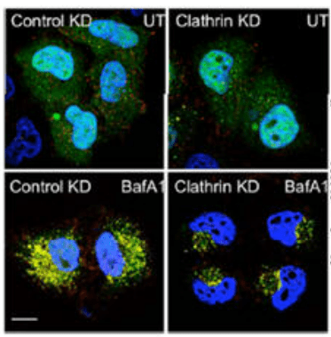 Très logiquement, la genèse de lysosomes et d’autophagosomes est souvent coordonnée. Le facteur de transcription à hélice-boucle-hélice/leucine zipper TFEB est un régulateur principal de la biogenèse des lysosomes et de l’autophagie. En conditions normales, TFEB subit une phosphorylation médiée par mTOR et reste dans le cytosol. L’action de facteurs de croissance ou la présence d’une quantité suffisante d’acides aminés active en effet mTOR qui inhibe l’autophagie en phosphorylant TFEB. Lorsqu’il y a pénurie de nutriments et que mTOR n’est plus activé ou lorsque les conditions de stockage dans les lysosomes deviennent saturées, TFEB est déphosphorylé puis est transloqué dans le noyau où il active ses gènes cibles via le système CLEAR (pour Coordinated Lysosomal Expression and Regulation). Contrairement aux activateurs purement autophagiques, TFEB favorise la clairance en régulant plusieurs étapes de la chaine de dégradation lysosomale-autophagique, notamment la formation de lysosome, la formation d’autophagosomes et la fusion autophagosome-lysosome (Sardiello et al., 2009, Song et al., 2021).