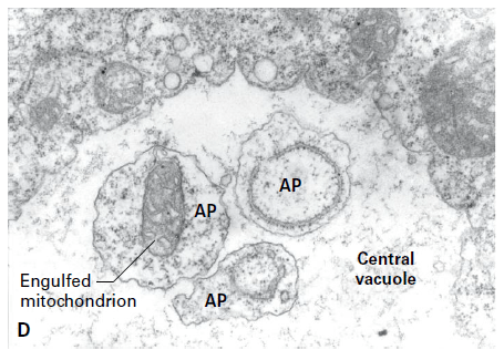 L’autophagie représente une voie de dégradation de composants cellulaires par les lysosomes (ou les vacuoles chez les cellules végétales). C’est un processus physiologique qui permet de se débarrasser de composants obsolètes ou défectueux et permet de recycler des molécules utiles. Elle est notamment déclenchée en période de pénurie de nourriture.
