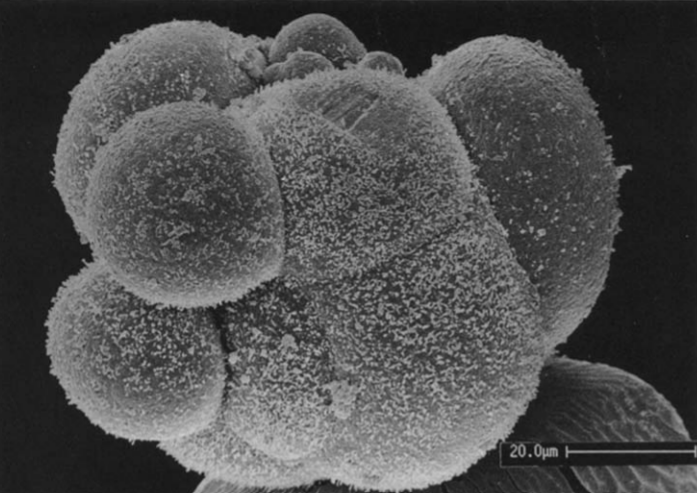 Bien que similaires en apparence, ces blastomères ne sont pas identiques. Hans Spemann a montré en 1903 que si on sépare les blastomères, seuls ceux qui ont hérité du croissant gris (une région partiellement pigmentée générée par la rotation corticale à la suite de la fécondation) donne des embryons normaux tandis que les autres donnent des structures sans axes définis. Le troisième plan de division est perpendiculaire aux deux précédents, parallèle à l’ »équateur » mais légèrement décalé dans l’hémisphère animal. Les cellules générées n’ont plus les mêmes tailles avec 4 cellules plus petites (appelées micromères) autour du pôle animal et 4 cellules plus grosses (appelées macromères) du côté du pôle végétatif. Puis de nouveaux clivages permettent d’arriver au stade 16 cellules, le stade morula.