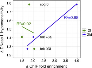 L’activation massive de la transcription au cycle nucléaire 14 s’accompagne de modifications importantes de la chromatine qui est notamment permise par la présence de facteurs dit pionniers tels que le facteur de transcription d’origine maternel Zelda qui se lie aux nucléosomes et rendent l’ADN plus accessible (Melody Foo et al., 2014). La perte de Zelda aboutit à une baisse drastique des gènes dont la transcription est activée lors de la transition mi-blastuléenne.