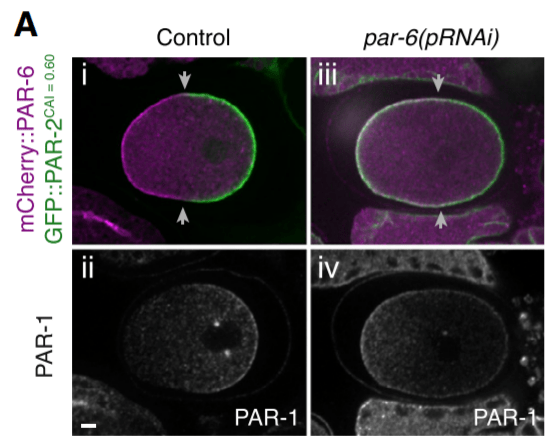 PKC-3 phosphoryle PAR-1 et PAR-2, les obligeant à se dissocier du cortex et empêchant ainsi leur invasion dans le domaine PAR antérieur. De même, PAR-1 et PAR-2 empêchent les PAR antérieurs d’envahir le domaine postérieur du cortex, en partie par la phosphorylation de PAR-1 et de PAR-3 qui provoque leur dissociation du cortex. La réduction de l’activité de l’un ou l’autre des complexes PAR conduit à la croissance du domaine PAR opposé, ce qui indique que l’équilibre entre les activités PAR antérieures et postérieures aident à positionner leur interface au milieu de l’axe antéro-postérieur.