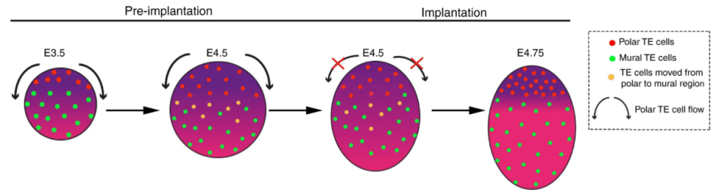 Lors de l’implantation, le blastocyste établit des contacts avec le tissu maternel et finit par s’attacher à l’endomètre avant d’y pénétrer. L’attachement et l’adhésion à l’endomètre maternel (à E4.75 chez la souris, au jour 7 post-fécondation chez l’Homme) sont médiés par le trophectoderme. A ce stade de développement, deux sous-populations du trophectoderme peuvent être distinguées : la région en contact avec la MCI située au pôle embryonnaire de l’embryon devient le trophectoderme polaire (qui formera l’ectoderme extra-embryonnaire qui contribue fortement à la formation du placenta) et la région entourant la cavité du blastocœle localisée au pôle abembryonnaire devient le trophectoderme mural (qui formera la couche externe du vésicule vitelline pariétale).