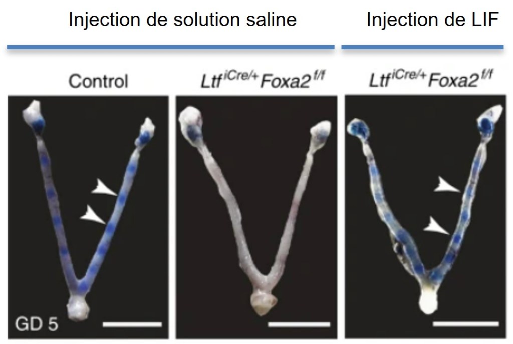 Dans la période précédant l’implantation et pendant l’implantation, l’endomètre utérin est loin d’être passif. Les glandes utérines nourrissent bien sûr l’embryon et sécrètent également du LIF (pour Leukemia Inhibitory Factor) qui déclenche dans les cellules du trophectoderme une cascade de signalisation qui est indispensable à une bonne implantation (Kelleher et al., 2018).