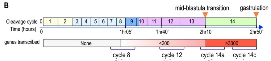 Ce moment donne lieu également à la transition mi-blastuléenne qui voit s’activer la transcription de nouveaux ARNm (dits zygotiques) et l’élimination des ARNm maternels. Cependant, signalons que quelques gènes zygotiques sont exprimés à partir du cycle nucléaire 7.