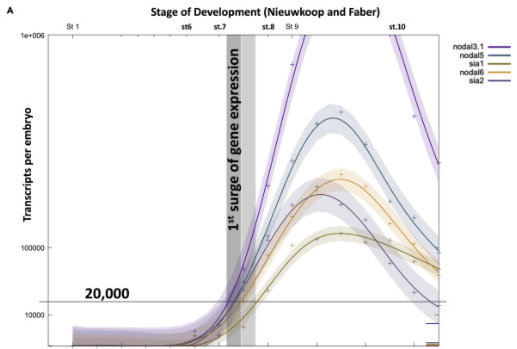 Des expériences de recombinaisons telles que celles effectuées par Nieuwkoop ont montré que le mésoderme est induit à partir de l’ectoderme à partir de signaux provenant de l’endoderme. On parle d’induction du mésoderme. Ces signaux sont déjà polarisés puisque de l’endoderme dorsal induit du mésoderme dorsal, et de l’endoderme ventral induit du mésoderme ventral. On connait maintenant la signalisation impliquée. Il s’agit de la signalisation Nodal de la famille des ligands TGFβ (ligands Xnr chez le xénope).