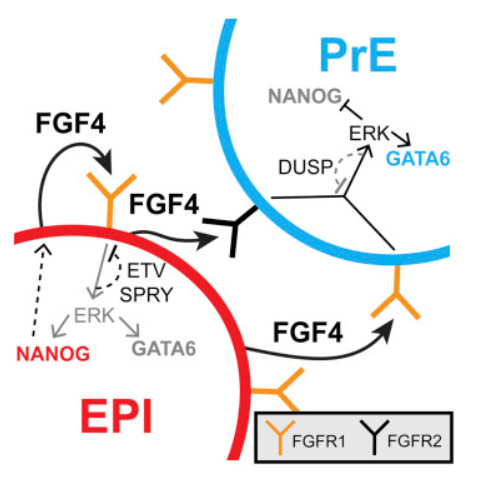 A E4,5, les populations Nanog+ (épiblaste) et Gata6+ (endoderme primitif) sont ségrégées par la signalisation FGF4 (Yamanaka et al., 2010). Ainsi, les cellules exprimant le récepteur FGFR1 ainsi que la signalisation autocrine FGF4 s’engagent dans l’épiblaste, tandis que la signalisation paracrine FGF4 via FGFR1 et FGFR2 détermine les cellules de l’endoderme primitif. Les niveaux d’ERK actifs relativement faibles dans les cellules FGFR1+ déclenchent une rétroaction négative avec ERK, augmentant l’expression de Nanog et l’identité pluripotente de l’épiblaste. En revanche, la signalisation FGF dans les cellules FGFR1+/FGFR2+ avec des niveaux élevés d’ERK actifs stimule la transcription de cibles alternatives, telles que DUSP, ce qui réduit l’expression de Nanog et active celle de GATA6 dans le futur endoderme primitif (Kang et al., 2017). La suppression de l’activation de ERK par l’inhibiteur PD0325901 (PD032) ou l’inhibiteur de FGFR PD173074 tout comme les mutants perte-de-fonction FGF4-/- ou FGFR1-/-;FGFR2-/- induisent une conversion en épiblaste et aucune spécification en endoderme primitif n’est alors possible (McLean et al., 2014 ; Bessonnard et al., 2017).