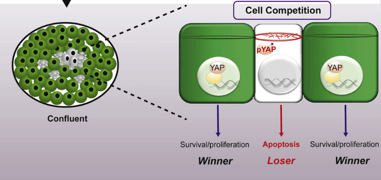 Ces mécanismes sont aussi présents dans les tumeurs et également dans les cultures de cellules embryonnaires souches (ES). Il existe une expression hétérogène de Myc dans des cellules ES de souris en culture. Ce déséquilibre Myc entraîne une compétition cellulaire et nécessite un contact cellulaire direct entre le vainqueur et la cellule éliminée. Des mécanismes biomécaniques via le cytosquelette d’actine sont également à l’oeuvre et le co-facteur de transcription YAP en aval des stiumuli biomécaniques se retrouve phosphorylé puis dégradé dans les cellules qui seront éliminées. En revanche, YAP entre dans le noyau et régule la transcription dans les cellules qui survivent (Price et al., 2021).