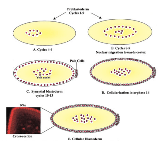 Les 9 premiers cycles de réplication/mitose se produisent profondément dans le vitellus de l’embryon et sont très rapides, toutes les 10 minutes. Au cycle nucléaire 10, les noyaux migrent vers la périphérie et commencent à organiser la formation de structures d’actine corticale qui initient ensuite la formation de sillons de type cytodiérèse qui aboutissent à la véritable cellularisation de l’embryon. L’embryon est cellularisé au cycle nucléaire 14. La cellularisation se fait en 10 minutes durant lesquels des vésicules cytoplasmiques fusionnent pour former la membrane plasmique.