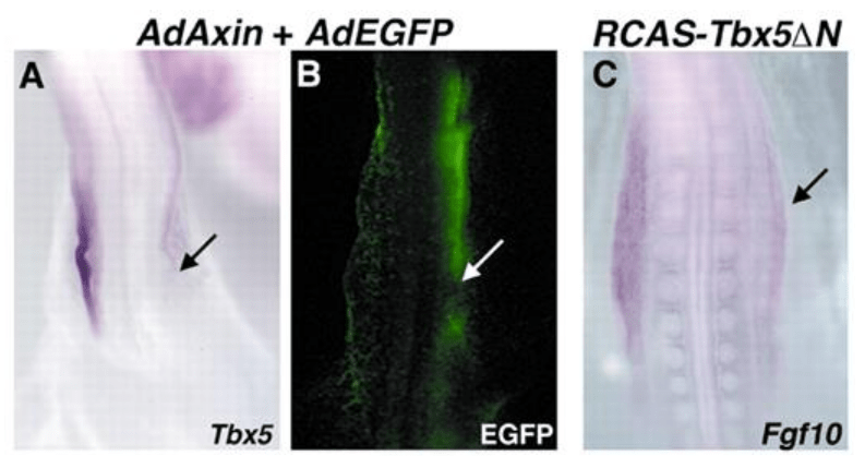 L’induction du développement du bourgeon de membre est réalisée par l’acide rétinoïque mais aussi par Wnt2b qui est exprimé dans les somites et dans la partie médiale des lames latérales (Ng et al., 2002). L’acide rétinoïque et Wnt2b induisent l’expression de Tbx5 qui active ensuite directement l’expression de FGF10 dans le mésenchyme (Agarwal et al., 2003). Dans le bourgeon de membre postérieur, c’est Tbx4 qui joue le rôle de Tbx5.