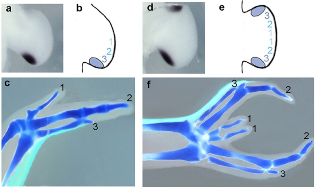 La greffe d’une ZPA de souris dans la partie antérieure d’un bourgeon de membre de poulet provoque également une duplication en miroir des doigts (dont les cellules seront formées à partir des cellules de poulet et non de souris, ce qui démontre une fois de plus l’induction). Cela démontre que le signal en provenance de la ZPA est conservé chez tous les Vertébrés.