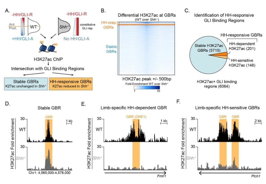 (A) Schéma expérimental permettant d’identifier différentes catégories de régions liées aux facteurs GLI (GBR). On compare les régions liées à GLI dépendant ou indépendant de la présence de Shh, en comparant les résultats des immunoprécipitations avec un anticorps reconnaissant la marque épigénétique H3K27 de bourgeons de membre de souris sauvage (WT) ou sans Shh (Shh-/-). Les bourgeons de membre utilisés proviennent de souris de E10,5. (B) Heatmap illustrant l’enrichissement différentiel en H3K27ac dans les bourgeons des membres WT et Shh-/- pour les GBR sensibles et insensibles (« stable ») à Shh. (C) Classification des catégories de GBR selon leur réponse obtenue en B (D-F) L’enrichissement en H3K27ac dans les bourgeons de membre WT et Shh -/- est montré dans une région génomique représentative près d’un GBR insensible (D) et des GBRs connus comme répondant à Shh : un GBR de GRE1 codant Gremlin1 (E) et un GBR de Ptch1 (F). Source : https://elifesciences.org/articles/50670