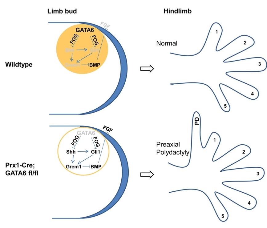 Des mutations ponctuelles dans cet enhancer provoque des malformations des doigts chez l’Homme comme la polydactylie préaxiale de type 2, la syndactylie de type IV ou le syndrome mésomélique de Werner (Lettice et al., 2003, 2008; Farooq et al., 2010; Furniss et al., 2008; Gurnett et al., 2007; Semerci et al., 2009; Wieczorek et al., 2010). Les limites du domaine d’expression de Shh sont contrôlées au cours du développement du bourgeon par les facteurs de transcription de type Ets, Etv4 et Etv5 (Lettice et al., 2012). Si on mute leurs sites de liaison dans la ZRS, une expression ectopique de Shh apparaît dans la région antérieure du bourgeon, ce qui aboutit à des malformations digitales. GATA6 intervient également pour éviter une expression antérieure de Shh (Kozhemyakina et al., 2014).