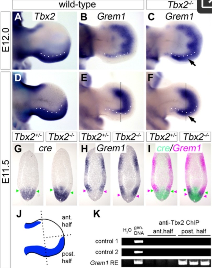 (A–F) Analyse en hybridation in situ de l’expression de Tbx2 et de Grem1 dans les membres postérieurs d’embryons à E12.0 et E11.5 sauvages ou Tbx2−/−. Les flèches (C, F) indiquent l’expansion postérieure de l’expression de Grem1 dans les bourgeons Tbx2−/−. Des lignes pointillées blanches délimitent la limite antérieure de l’expression de Tbx2. (G–I) Analyse comparative de l’expression de cre, contrôlée par les régions régulatrices de Tbx2, et de Grem1 par hybridation in situ sur des sections sagittales adjacentes des membres postérieurs d’embryons E11.5 Tbx2cre/+ (contrôle) et Tbx2cre/cre (mutant). Les plans de coupe sont indiqués par des lignes noires en E et F. Les pointes de flèches marquent la limite antérieure de l’expression cre (en vert) et la limite postérieure de l’expression Grem1 (en rose). Les superpositions de fausse couleur dans (I) montrent l’expansion postérieure de Grem1 dans les membres postérieurs de Tbx2−/−. (J–K) Analyse en ChIP (immunoprécipitation de la chromatine) utilisant la chromatine des moitiés antérieure ou postérieure des membres postérieurs de type sauvage E11.5. Le schéma (J) montre l’expression de Tbx2 (bleu) exclusivement dans la moitié postérieure du membre. (K) Détection par ChIP-PCR des régions d’ADN liées à Tbx2. L’ADN génomique total a été utilisé comme témoin positif. Dans les moitiés postérieures des membres, Tbx2 se lie à l’enhancer qui contrôle l’expression dans le membre de Grem1 mais pas aux autres régions génomiques qui servent de contrôle. Source : https://journals.plos.org/plosgenetics/article?id=10.1371/journal.pgen.1003467
