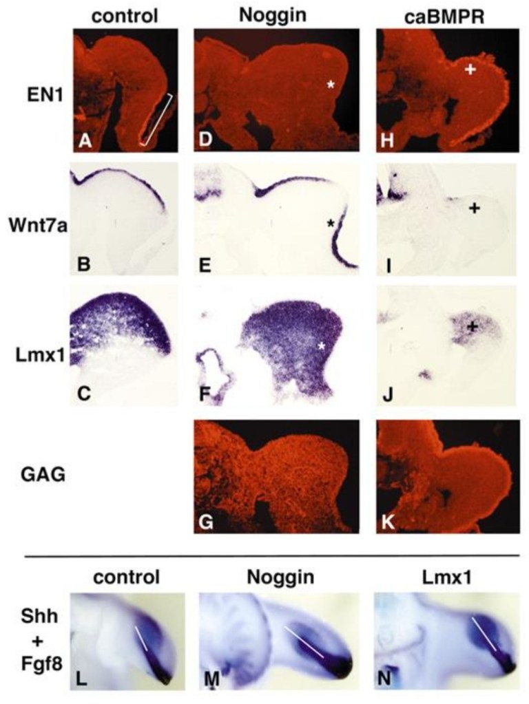 Cette expression est induite par des BMP en provenance du mésenchyme mésodermique (Pizette et al., 2001). Engrailed-1 réprime alors l’expression de Wnt7a dans l’ectoderme ventral permettant à ce que son expression soit strictement cantonnée à l’ectoderme dorsal.