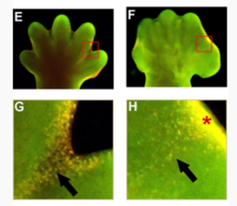 Signalons que paradoxalement, une bonne vascularisation de la zone interdigitale est nécessaire pour que l’apoptose y soit activée et cela est sans doute lié au fait que des espèces réactives de l’oxygène (ROS) et donc le stress oxydatif sont nécessaires pour l’apoptose interdigitale (une bonne vascularisation assure un bon apport en O2 permettant de produire des ROS) (Eshkar-Oren et al., 2015).