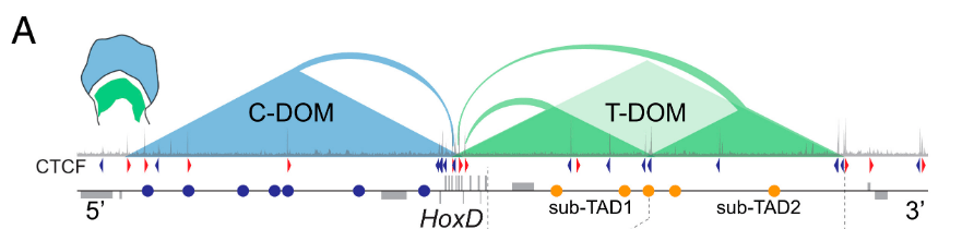 D’un côté du groupe de gènes Hox, une série d’enhancers (dans le domaine chromatinien appelé T-DOM) contrôlent l’expression proximale de Hoxd9 à Hoxd11 et de l’autre côté, une série d’enhancers (dans le domaine chromatinien appelé C-DOM) contrôlent l’expression distale de Hoxd12 à Hoxd13 (Montavon et al., 2011 ; Andrey et al., 2013). Une frontière de TAD (domaine d’activation topologique) avec des protéines CTCF attachées dessus entre les gènes Hoxd11 et Hoxd12 assurent une relative imperméabilité entre les deux séries d’enhancers, empêchant par exemple Hoxd13 d’être exprimé dans la région proximale (Rodriguez-Carballo et al., 2017).