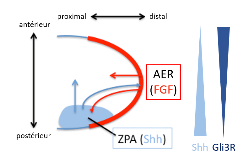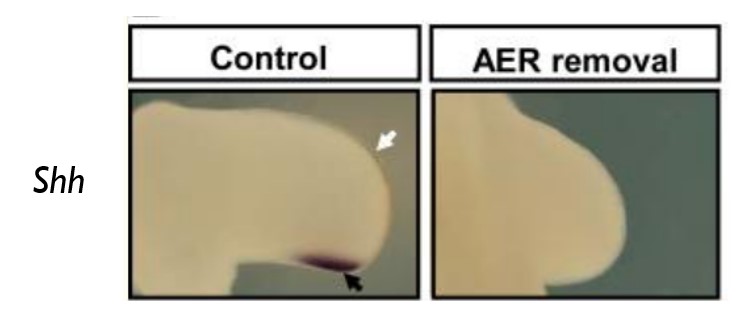 La manipulation de l’AER chez l’embryon de poulet a établi que l’AER est nécessaire pour induire l’expression de Shh.