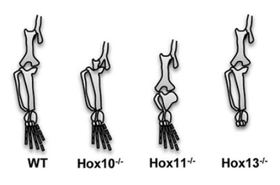 Parmi les cibles de la voie de signalisation Shh potentiellement régulatrices de l’identité des doigts, les gènes de la partie 5′ des complexes Hoxd et Hoxa ont été les plus fortement impliqués sur la base des phénotypes des mutants simples et composés (Davis et Capecchi, 1996, Zakany et al., 1997). Cependant, il n’y a pas de « code Hox » ; leurs cibles sont encore mal comprises et les mécanismes par lesquels ils transmettent des indices de position précoces restent peu caractérisés.
