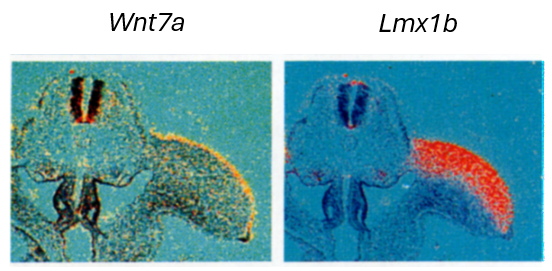 La polarité dorso-ventrale correspond par exemple à la différence entre le dos et la paume de la main. C’est l’ectoderme qui contrôle l’identité dorso-ventrale du mésenchyme mésodermique du bourgeon de membre car si, avec des excisions et des greffes, on inverse les positions de l’ectoderme dorsal et de l’ectoderme ventral, l’ensemble du membre aura une polarité inversée. Cela amène à penser qu’un signal inducteur est envoyé de l’ectoderme au mésoderme sous-jacent. Ce signal inducteur a été identifié comme Wnt7a et il est sécrété par les cellules de l’ectoderme dorsal (et pas par les cellules de l’ectoderme ventral) (Parr et McMahon, 1995). Il induit l’expression du facteur de transcription Lmx1b dans le mésoderme dorsal (Riddle et al., 1995).