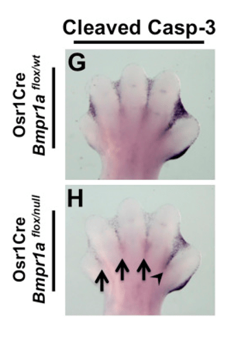 L’apoptose dans le mésenchyme interdigital est indispensable à la morphogenèse des doigts. Elle est induite par les BMP (Kaltcheva et al., 2016)