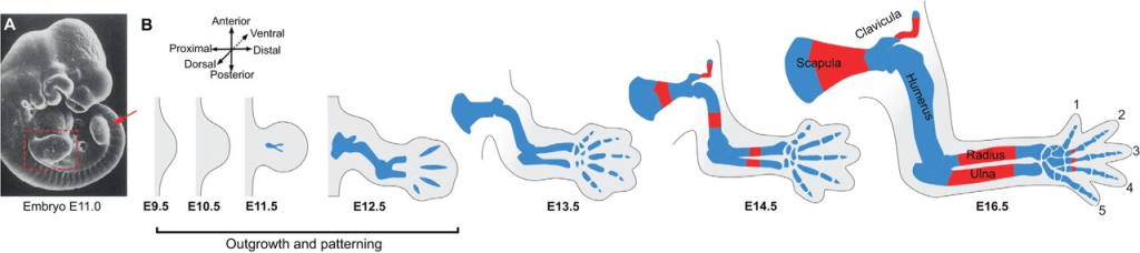 Au cours du développement, les bourgeons s’agrandissent et les éléments cartilagineux du futur squelette et les masses musculaires se mettent progressivement en place.