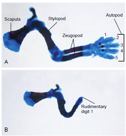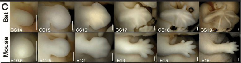 Les mécanismes moléculaires de ces différences ont été étudiés. Dans la zone interdigitale de la future aile de la chauve-souris ainsi que de la future patte postérieure de canard, un ligand Gremlin est produit et inhibe l’action des BMP. Dans la future aile de la chauve-souris des ligands FGF agissent en complément pour maintenir en vie les cellules de la zone interdigitale et en plus activer leur prolifération ce qui permet de créer la grande surface portante interdigitale.