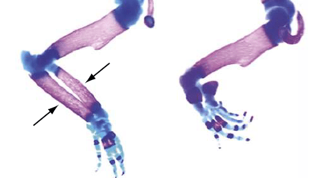 Les pertes-de-fonction de Shh aboutissent aussi à une réduction du nombre de doigts ce qui est l’opposé de la multiplication par deux du nombre de doigts en cas d’expression ectopique de Shh dans la région antérieure. On constate donc qu’en plus de la fonction de polarisation selon l’axe antéro-postérieur, Shh joue un rôle dans l’induction de la formation des doigts en tant que telle.