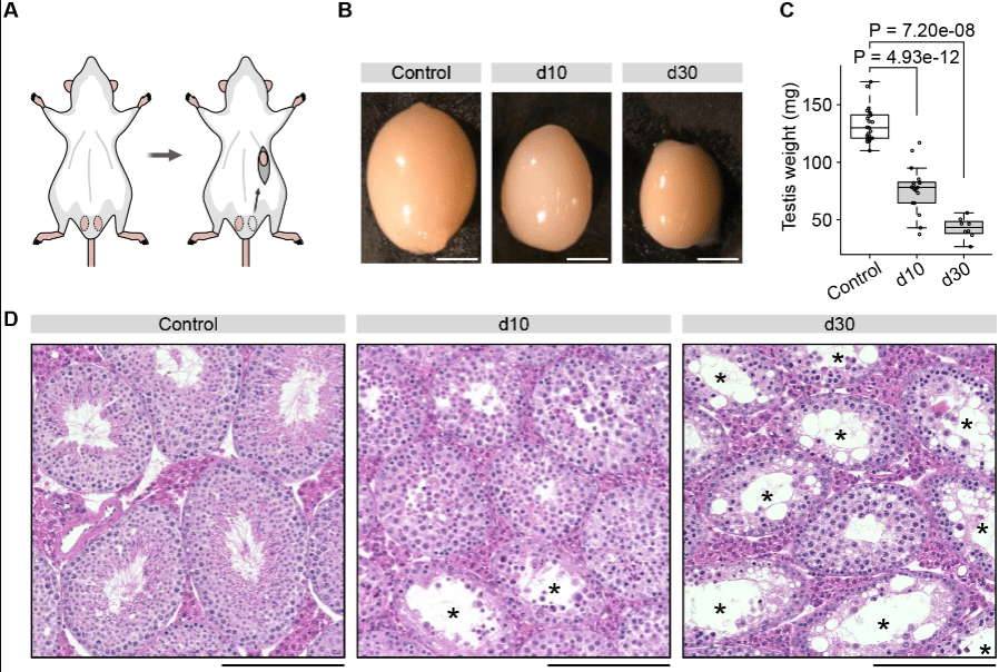 (C) Évolution du poids testiculaire, montrant une diminution significative dans les groupes d10 et d30 par rapport au contrôle. (D) Coupes histologiques colorées à l’hématoxyline-éosine de testicules contrôles et cryptorchides, révélant une désorganisation progressive de l’épithélium séminifère, une raréfaction des cellules germinales et l’apparition de tubules atrophiques et vacuolisés marqués par des astérisques. Source : https://journals.biologists.com/dev/article/152/2/dev204239/365003/Abnormal-H3K27me3-underlies-degenerative