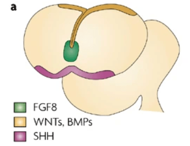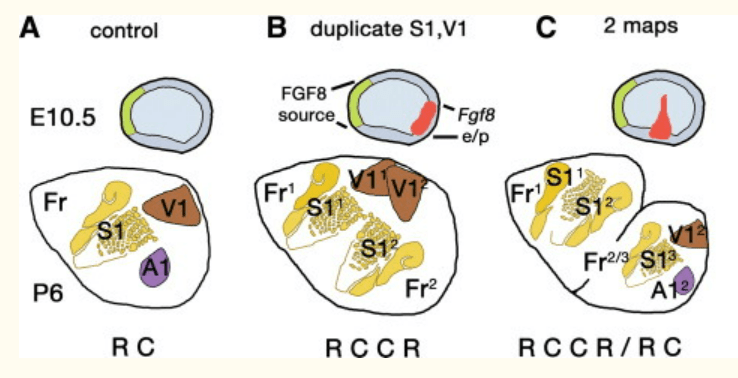Les FGF sont produits dans la région la plus antérieure du système nerveux qu’on appelle l’ANR (pour Anterior Neural Ridge) (Eagleson et al., 2002). Cette région est induite chez la souris par l’endoderme viscéral antérieur (AVE), une structure extraembryonnaire qui produit aussi des FGF. A partir de l’ANR, FGF diffuse dans le futur cortex induisant des structures antérieures à forte concentration et des structures postérieures à faible concentration.