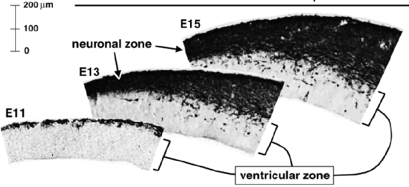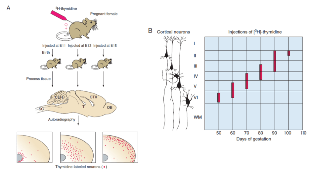 Les 6 couches sont générées de manière inversée. Les neurones les plus précoces occupent les couches les plus profondes et les derniers neurones produits occupent les couches les plus superficielles. Les neurones se développent par vagues de neurogenèse, migration radiale et différenciation à partir des progéniteurs gliaux radiaux de la zone ventriculaire et des cellules progénitrices intermédiaires de la zone sous-ventriculaire.