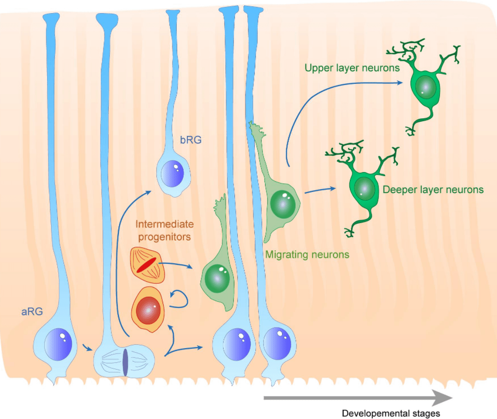 Les neurones (puis les cellules gliales, nous le verrons plus loin) sont générés à partir de cellules souches neuronales qui sont en fait des cellules de la glie radiaire qualifiée de apicale (aRG) car leur prolongement est en contact avec la partie apicale du neuroépithélium (du côté du ventricule, c’est-à-dire de la lumière du tube neural). La polarité de ces cellules neuroépithéliales est très importante, ce qui est illustré par le fait que des perte-de-fonctions de gènes codant des protéines impliquées dans la structure des jonctions serrées et des jonctions adhérentes qui sont essentielles pour le maintien de la polarité aboutissent à des développements anormaux du cortex tels que des microcéphalies ou favorise la survenue de l’autisme et de crises d’épilepsie (O’Driscoll et al., 2010, Bendriem et al., 2019; Sterling et al., 2020).