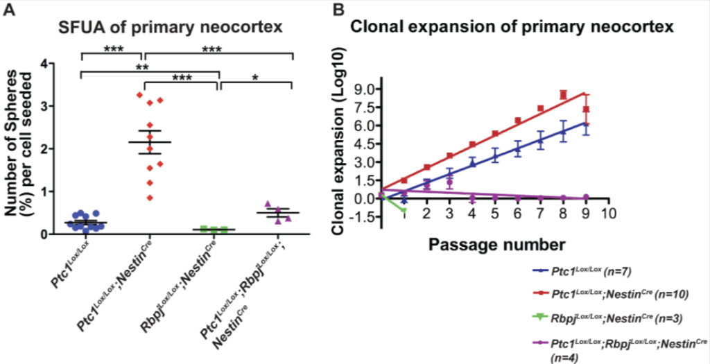 (A) Les souris Ptc1Lox/Lox;NestinCre (n = 10) présentent une activité Sonic Hedgehog élevée et constitutive dans les cellules souches neurales car on y a délété le gène codant Patched1 qui est un inhibiteur de cette voie. On génère des neurosphères à partir du cortex de ces souris (et de témoins ainsi que de souris RbpjLox/Lox;NestinCre qui ne peuvent plus activer la voie Notch dans les cellules souches neurales). La suractivation de la voie Shh aboutit à une augmentation de 8 fois du nombre de colonies de neurosphères primaires par cellule ensemencée par rapport aux témoins de la même portée. Cependant la voie Notch doit concomitamment être fonctionnelle. (B) Expansion clonale des neurosphères dérivées de cortex à E14.5. Le nombre de cellules obtenues à chaque passage a été exprimé en logarithme (Log10) et une analyse de régression linéaire a été réalisée sur les courbes obtenues. Le taux d’expansion clonale des neurosphères est représenté par la pente de la ligne. Le nombre de cellules souches est significativement plus élevé dans les neurosphères Ptc1Lox/Lox;NestinCre par rapport aux neurosphères Ptc1Lox/Lox. Cependant, une fois de plus, la voie Notch doit pouvoir être activée. Source : https://journals.plos.org/plosone/article?id=10.1371/journal.pone.0014680