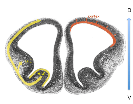 Les interneurones inhibiteurs GABAergiques, qui n’envoient généralement que des projections axonales locales, constituent environ 25 % des neurones du cortex humain et sont subdivisés en de nombreux types selon l’expression des gènes, la morphologie, la connectivité et les propriétés physiologiques. Ces interneurones ne sont pas générés sur place, contrairement aux neurones excitateurs. Ils sont générés ventralement à partir des éminences ganglionnaires médiales et leurs précurseurs migrent ensuite dans le cortex.