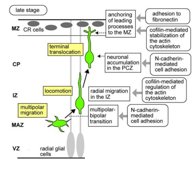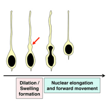 La migration radiale des nouveaux neurones est réalisée par la succession de plusieurs cycles de formation d’une protrusion frontale suivie par une nucléokinèse, c’est-à-dire le déplacement du noyau à l’intérieur du cytoplasme. Tous ces mouvements dépendent d’une importante coordination entre la dynamique des microfilaments et des microtubules.