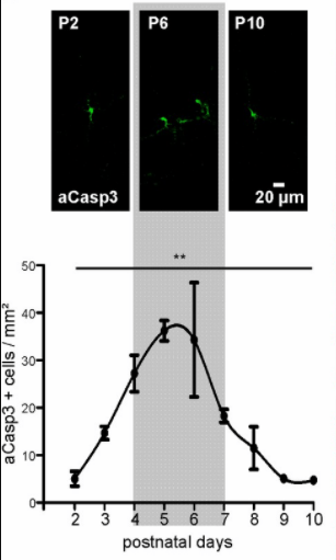 Une proportion importante de progéniteurs neuronaux (les estimations varient entre 20 et 60%) meurt par apoptose durant le développement embryonnaire. Des souris n’exprimant pas Apaf-1 ou la caspase 9 qui sont des activateurs de l’apoptose présentent des zones progénitrices élargies (Yoshida et al., 1998). Dans les premiers jours après la naissance, des neurones en train d’être incorporés dans les circuits meurent également (autour de 30% des neurones). Le taux d’apoptose varie selon les régions corticales, avec plus de mort cellulaire dans le cortex moteur que dans le cortex somatosensoriel par exemple (Blanquie et al., 2017).