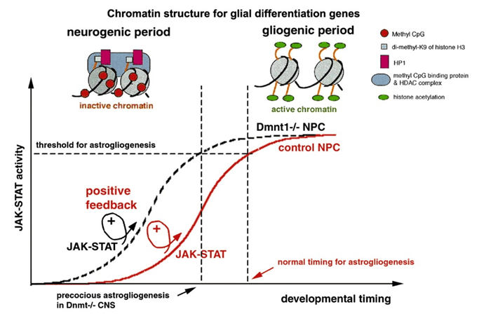 Des cellules souches neurales avec une triple potentialité puis une bipotence transitoire ont pu être cultivées : NA (neurones + astrocytes), NO (neurones + oligodendrocytes) et AO (astrocytes-oligodendrocytes). Des ligands orientant vers l’une ou l’autre voie ont été identifiés. Par exemple, le CNTF oriente fortement le destin des progéniteurs générés vers la voie astrocytaire et stimule également la prolifération des progéniteurs astrocytaires (Ravin et al., 2008). CNTF active le facteur de transcription STAT3 qui se fixe directement sur les promoteurs des gènes GFAP et S100, qui sont des gènes exprimés dans les cellules gliales. Dans les progéniteurs générés tôt dans le développement, l’ADN du promoteur de GFAP est méthylé, ainsi STAT3 ne peut pas déterminer les cellules en glie et ce sont des neurones qui sont d’abord produits avant que cette marque épigénétique inhibitrice soit enlevée (Fan et al., 2005). L’absence de l’ADN méthyltransférase de maintenance DNMT1 dans les précurseurs neuronaux aboutit à leur différenciation en astrocytes. A l’inverse, l’absence d’enzymes de déméthylation TET inhibe le potentiel des cellules souches neurales de donner des cellules gliales (MacArthur et al., 2024).