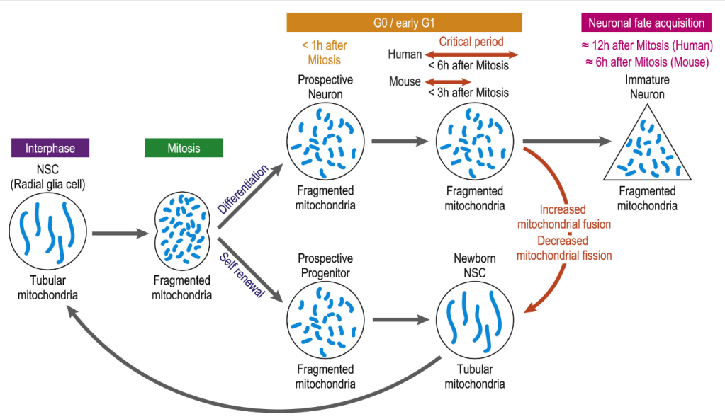 Ces cellules souches peuvent subir une division symétrique qui génère deux cellules souches (expansion) ou une division asymétrique où l’une des cellules reste cellule souche (auto-renouvellement) et l’autre devient un précurseur qui peut proliférer mais qui finira par se différencier (en neurone ou en cellule gliale). La régulation entre division symétrique ou asymétrique dépend de nombreux paramètres, notamment de l’orientation du fuseau mitotique et, étonnamment, de la taille des mitochondries (les cellules qui gardent des caractères de cellule souche ont de longues mitochondries tubulaires, les cellules qui perdent ces caractères ont des mitochondries plus nombreuses mais plus petites) (Iwata et al., 2021).