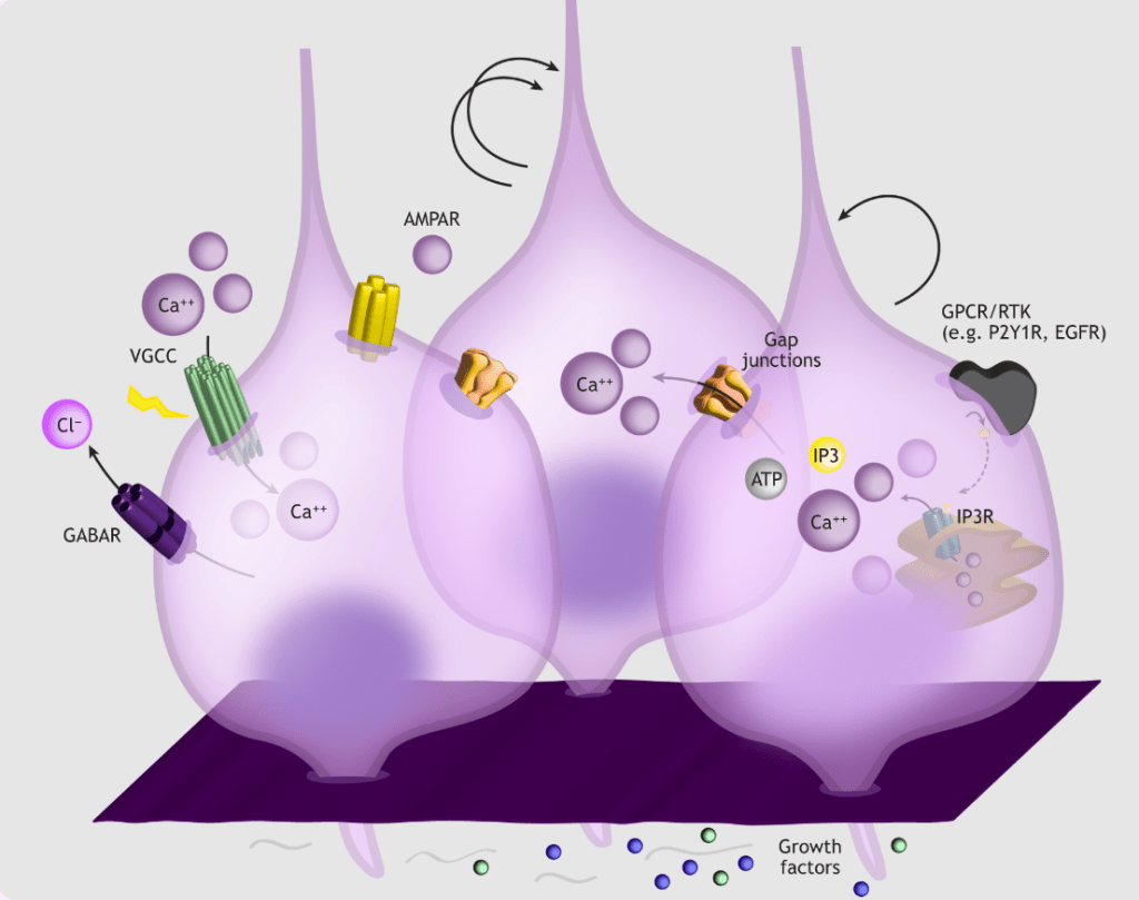 La prolifération des cellules de la glie radiaire est aussi sous le contrôle de la signalisation calcique (McKinney et al., 2022).