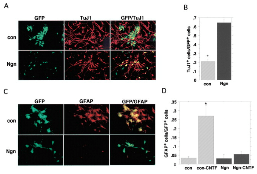 Des cultures primaires de cortex de rat au stade E14 ont été infectées par des rétrovirus permettant d’exprimer Ngn1 ou un gène contrôle (con). Quatre jours après mise en culture/infection, les cellules ont été fixées et soumises à une immunofluorescence pour les marqueurs de différenciation neuronale (TuJ1) et astrocytaire (GFAP). Les cellules infectées étaient positives pour la GFP (A et C). En (C), mais pas en (A), les cellules ont été traitées avec du CNTF pendant quatre jours pour favoriser la différenciation des astrocytes. Source : https://www.sciencedirect.com/science/article/pii/S0092867401002240