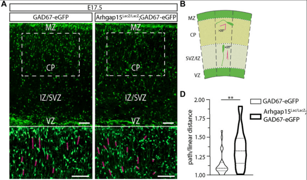 Des protéines contrôlant le cytosquelette tels que les petites GTPases Rho, Rac et Cdc42 sont importantes pour la migration radiale des nouveaux neurones (qu’ils soient excitateurs ou inhibiteurs). Par exemple, Rac1 est exprimé à l’avant de ces neurones et sa fonction est contrôlée par la protéine de type GAP (GTPase-Activating Protein) ARHGAP15 qui inhibe Rac1. En absence d’ARHGAP15, les futurs neurones ont une migration qui n’est pas seulement radiale mais multidirectionnelle ce qui les amène à des destinations anormales. ARHGAP15 agit en limitant la capacité de Rac1 à produire des prolongements cellulaires exploratoires, ce qui aboutit à une meilleure directionalité de la migration (Liaci et al., 2022).