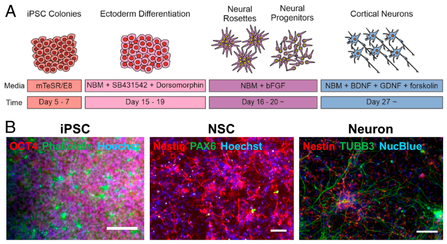 De nombreux protocoles existent pour différencier des neurones corticaux à partir de cellules ES ou iPS. Ils s’appuient sur la signalisation qui se déroule lors du développement embryonnaire normal : il s’agit d’abord d’induire du tissu neural (donc de bloquer la signalisation BMP pour mimer l’effet de l’organisateur de Spemann), puis d’induire la régionalisation antérieure. Selon les besoins, on peut manipuler la signalisation qui permet la régionalisation dorso-ventrale (par exemple stimuler la voie de signalisation Shh si on souhaite obtenir des interneurones inhibiteurs à GABA qui sont d’origine ventrale).