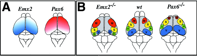 Chez l’animal de type sauvage (wt), le cortex moteur (M) est principalement situé dans le cortex antérieur, et les autres régions sensorielles somatosensorielle (S), auditive (A) et visuelle (V) sont situées dans le cortex moyen et postérieur, respectivement. Chez les souris déficientes en Emx2, la répartition est décalés vers la région postérieure et une plus grande région est occupée par le cortex moteur. En revanche, chez les souris déficientes en Pax6, le cortex visuel est élargi et le cortex moteur est très réduit. Source : https://academic.oup.com/cercor/article/13/6/641/360937